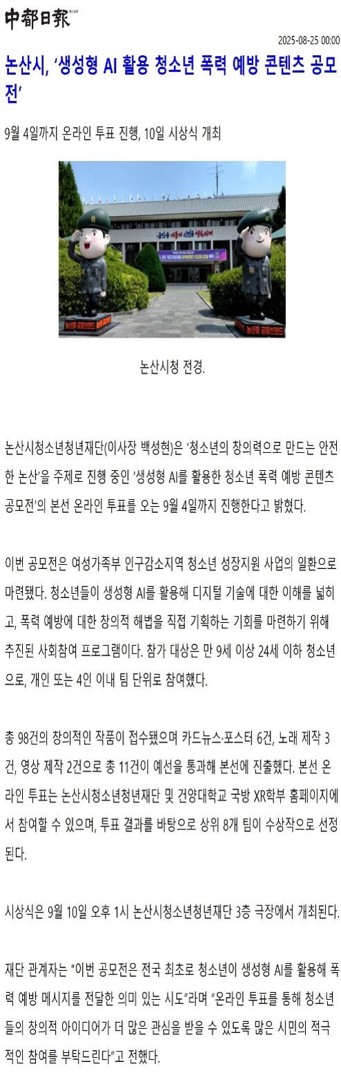 -창의력과 AI가 만났다! 논산시 청소년 폭력예방 콘텐츠 온라인 투표 참여하세요-