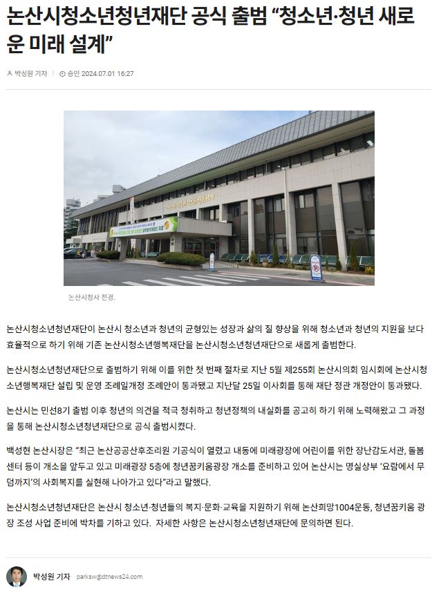 논산시는 민선8기 출범 이후 청년의 의견을 적극 청취하고 청년정책의 내실화를 공고히 하기 위해 노력해왔고 그 과정을 통해 논산시청소년청년재단으로 공식 출범시켰다.