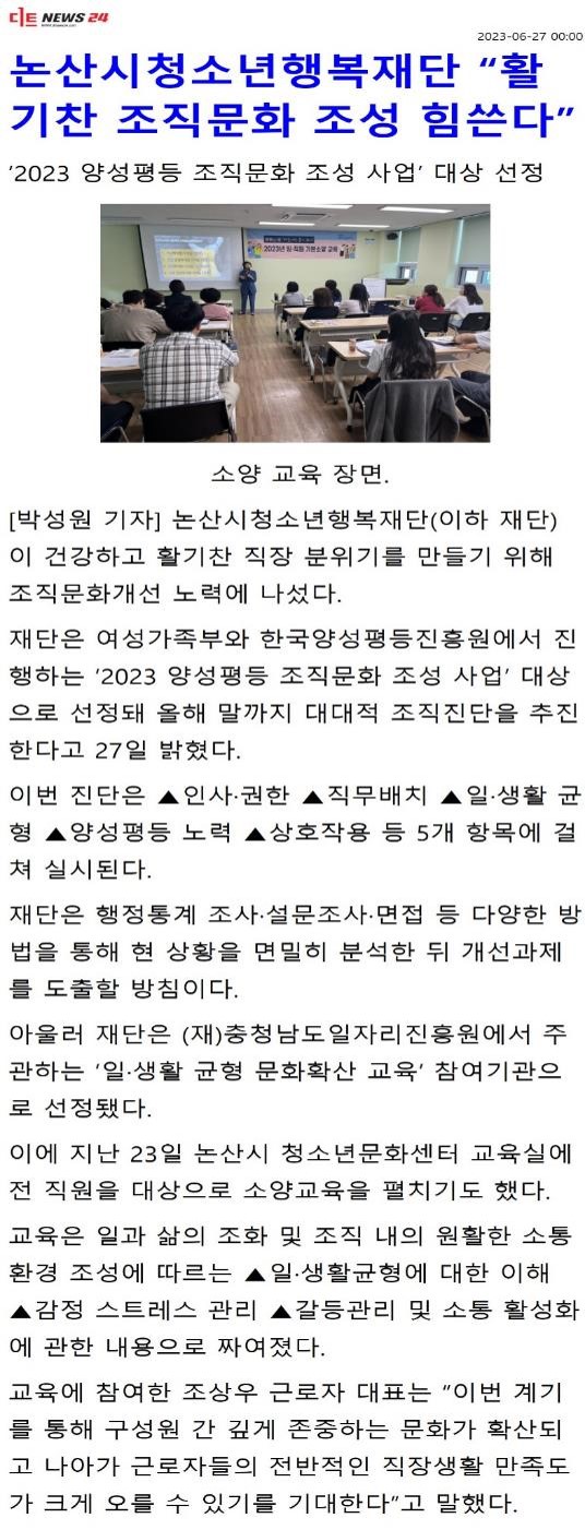 또한 재단은 (재)충청남도 일자리 진흥원에서 진행하는 <일·생활 균형 문화 확산 교육> 참여기관으로 선정되었다. 이에 따라 지난 6월 23일(금) 논산시청소년문화센터 교육실에서 전 직원을 대상으로 일·생활 균형 문화 확산 교육을 실시했다.