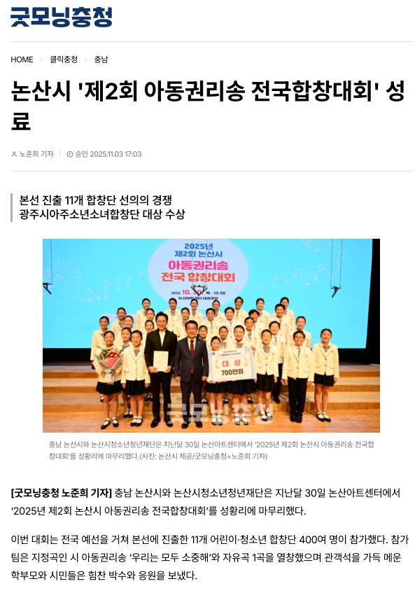 충남 논산시와 논산시청소년청년재단은 지난달 30일 논산아트센터에서 ‘2025년 제2회 논산시 아동권리송 전국합창대회’를 성황리에 마무리했다.