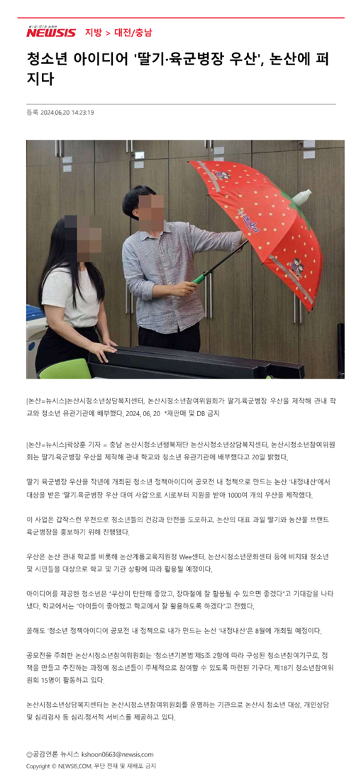 충남 논산시청소년행복재단 논산시청소년상담복지센터, 논산시청소년참여위원회는 딸기·육군병장 우산을 제작해 관내 학교와 청소년 유관기관에 배부했다고 20일 밝혔다.