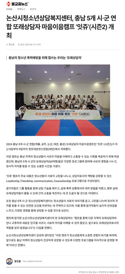 캠프에 참가한 논산시청소년상담복지센터의 한 또래상담자는 “캠프를 통해 다른 지역의 또래상담자와 만나 교류하여 새로운 친구를 사귀고, 서로의 차이를 이해할 수 있어 좋았고, 앞으로도 또래상담자로서의 역할을 잊지 않겠습니다”는 다짐을 전했다.