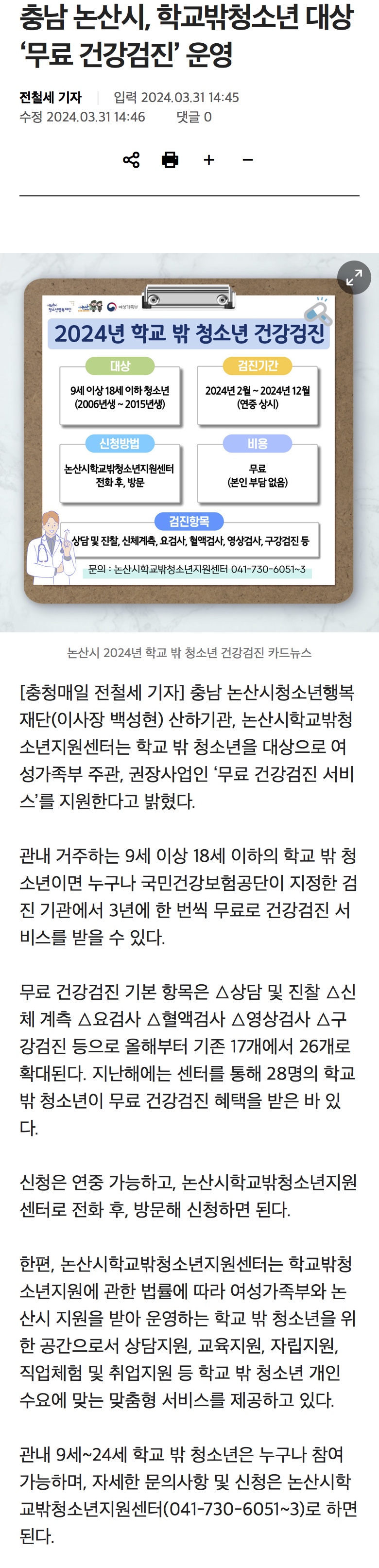 논산시학교밖청소년지원센터“무료 건강검진”상시 접수·운영 실시