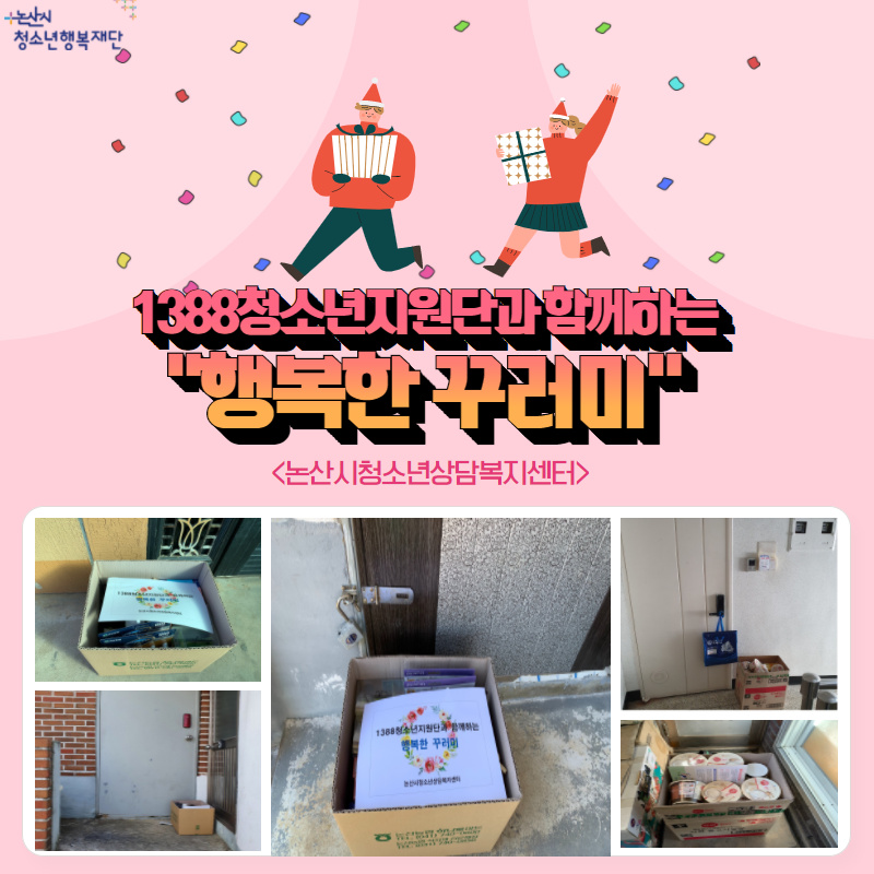논산시청소년상담복지센터(센터장 권경주)는 지난 11월 30일(월), 12월 9일(수) 2차례에 걸쳐 관내 30명 청소년 가정에게 “1388청소년지원단과 함께하는 행복한 꾸러미”를 지원하였다.