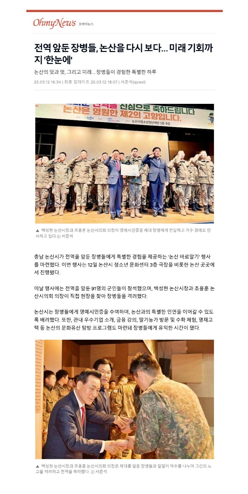 조용훈 논산시의회 의장은 "전역을 앞둔 장병들이 논산을 긍정적으로 기억하고, 앞으로도 논산과 인연을 이어가길 바란다"며 "논산이 단순한 훈련소가 아니라 기회의 도시로 자리 잡을 수 있도록 시의회에서도 지원을 아끼지 않겠다"고 밝혔다.