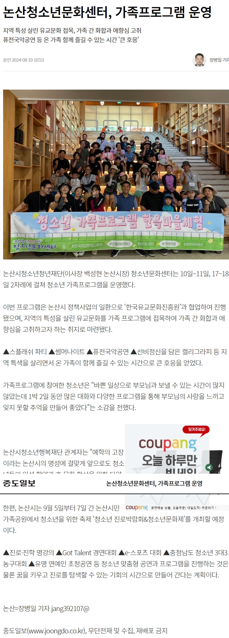 논산시청소년청년재단(이사장, 백성현논산시장) 청소년문화센터에서는 관내 청소년과 가족을 대상으로 폭염의 더위를 가족의 힘으로 이겨내고자 캠프를 마련하였다. 세대 간의 극복과 가정의 소중함, 유대감 증진을 위해 논산시 노성면에 위치한 ‘한국유교문화진흥원’과 협업하여 청소년 가족프로그램을 운영하였다.