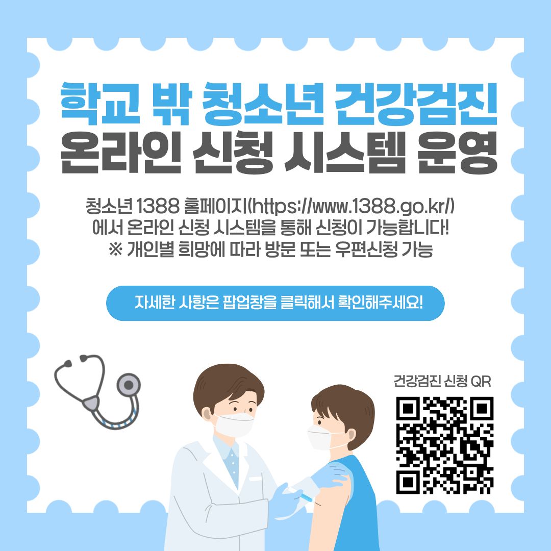 - 2026년 학교 밖 청소년 건강검진 온라인 신청시스템 운영 안내 안녕하세요. 논산시학교밖청소년지원센터입니다. 1388 홈페이지(https://www.1388.go.kr/)를 통해 온라인으로 학교 밖 청소년들의 건강검진 신청이 가능합니다. <<신청경로 안내>> 1) 청소년1388>추천 서비스> '학교... 2026.02.24