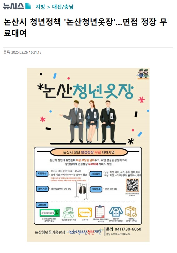 26일 논산시에 따르면 '논산청년옷장'은 청년들의 취업 준비 비용 부담을 줄이기 위해 면접 정장을 무료로 대여하는 사업이다. 서울 광진구 소재 ㈔열린옷장과 협약을 체결해 서비스를 제공한다.